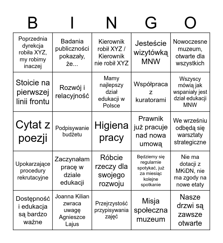 This bingo card has a free space and 24 words: Zaczynałam pracę w dziale edukacji, Joanna Kilian zwraca uwagę Agnieszce Lajus, Mamy najlepszy dział edukacji w Polsce, Dostępność i edukacja są bardzo ważne, Nowoczesne muzeum, otwarte dla wszystkich, Poprzednia dyrekcja robiła XYZ, my robimy inaczej, Stoicie na pierwszej linii frontu, Badania publiczności pokazały, że..., Prawnik już pracuje nad nowa umową, Róbcie rzeczy dla swojego rozwoju, Współpraca z kuratorami, Cytat z poezji, Będziemy się regularnie spotykać, już za miesiąc kolejne spotkanie, Nie ma dotacji z MKiDN, nie ma zgody na nowe etaty, Rozwój i relacyjność, Misja społeczna muzeum, We wrześniu odbędą się warsztaty strategiczne, Kierownik robił XYZ / Kierownik nie robił XYZ, Wszyscy mówią jak wspaniały jest dział edukacji MNW, Podpisywanie budżetu, Nasze drzwi są zawsze otwarte, Upokarzające procedury rekrutacyjne, Jesteście wizytówką MNW and Przejrzystość przypisywania zajęć.