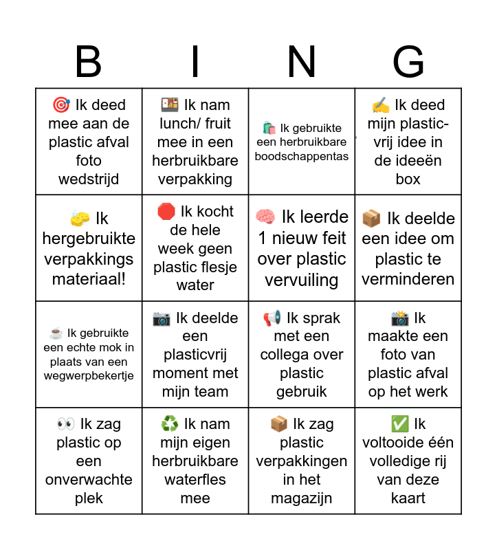 This bingo card has 1 images and 16 words: β»οΈ Ik nam mijn eigen herbruikbare waterfles mee, πΈ Ik maakte een foto van plastic afval op het werk, ποΈ Ik gebruikte een herbruikbare boodschappentas, π― Ik deed mee aan de plastic afval foto wedstrijd, β Ik gebruikte een echte mok in plaats van een wegwerpbekertje, π± Ik nam lunch/ fruit mee in een herbruikbare verpakking, π’ Ik sprak met een collega over plastic gebruik, π¦ Ik zag plastic verpakkingen in het magazijn, π§½ Ik hergebruikte verpakkings materiaal!, π Ik kocht de hele week geen plastic flesje water, π Ik zag plastic op een onverwachte plek, βοΈ Ik deed mijn plastic-vrij idee in de ideeΓ«n box, π· Ik deelde een plasticvrij moment met mijn team, π¦ Ik deelde een idee om plastic te verminderen, π§ Ik leerde 1 nieuw feit over plastic vervuiling and β Ik voltooide één volledige rij van deze kaart.