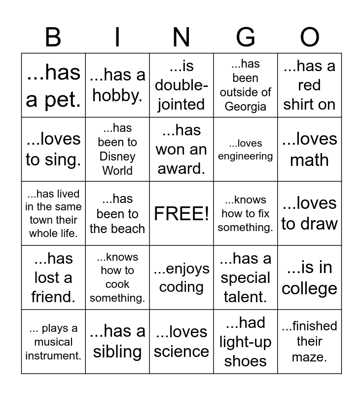 This bingo card has a free space and 24 words: ...knows how to cook something., ...has a sibling, ...has won an award., ... plays a musical instrument., ...has a red shirt on, ...has a pet., ...loves to sing., ...has a hobby., ...knows how to fix something., ...enjoys coding, ...loves engineering, ...has lived in the same town their whole life., ...has a special talent., ...is in college, ...has been to Disney World, ...had light-up shoes, ...loves to draw, ...is double-jointed, ...loves math, ...has been to the beach, ...finished their maze., ...has lost a friend., ...has been outside of Georgia and ...loves science.