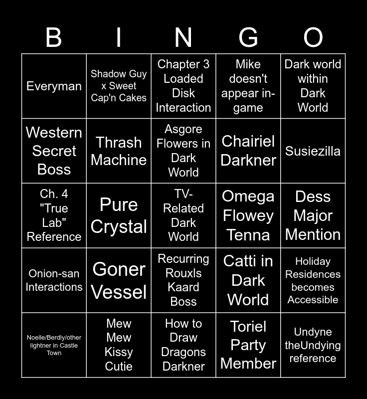 This bingo card has a free space and 24 words: Goner Vessel, Mew Mew Kissy Cutie, Asgore Flowers in Dark World, Noelle/Berdly/other lightner in Castle Town, Dark world within Dark World, Everyman, Western Secret Boss, Shadow Guy x Sweet Cap'n Cakes, Omega Flowey Tenna, Recurring Rouxls Kaard Boss, Chairiel Darkner, Ch. 4 "True Lab" Reference, Catti in Dark World, Holiday Residences becomes Accessible, Thrash Machine, Toriel Party Member, Dess Major Mention, Chapter 3 Loaded Disk Interaction, Susiezilla, Pure Crystal, Undyne theUndying reference, Onion-san Interactions, Mike doesn't appear in-game and How to Draw Dragons Darkner.