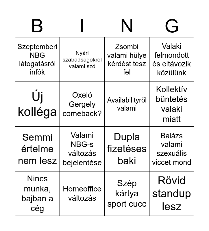This bingo card has 16 words: Homeoffice változás, Balázs valami szexuális viccet mond, Zsombi valami hülye kérdést tesz fel, Szeptemberi NBG látogatásról infók, Semmi értelme nem lesz, Nyári szabadságokról valami szó, Dupla fizetéses baki, Szép kártya sport cucc, Új kolléga, Oxeló Gergely comeback?, Nincs munka, bajban a cég, Valaki felmondott és eltávozik közülünk, Valami NBG-s változás bejelentése, Kollektív büntetés valaki miatt, Availabilityről valami and Rövid standup lesz.