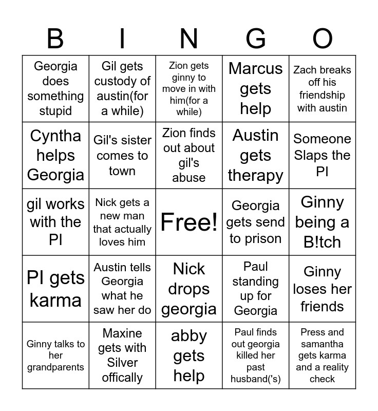 This bingo card has a free space and 24 words: Ginny talks to her grandparents, Austin tells Georgia what he saw her do, Zion finds out about gil's abuse, Paul finds out georgia killed her past husband('s), Zach breaks off his friendship with austin, Georgia does something stupid, Gil gets custody of austin(for a while), Zion gets ginny to move in with him(for a while), Georgia gets send to prison, Ginny being a B!tch, gil works with the PI, Gil's sister comes to town, Paul standing up for Georgia, Ginny loses her friends, Cyntha helps Georgia, Maxine gets with Silver offically, abby gets help, Marcus gets help, Someone Slaps the PI, PI gets karma, Nick gets a new man that actually loves him, Nick drops georgia, Austin gets therapy and Press and samantha gets karma and a reality check.
