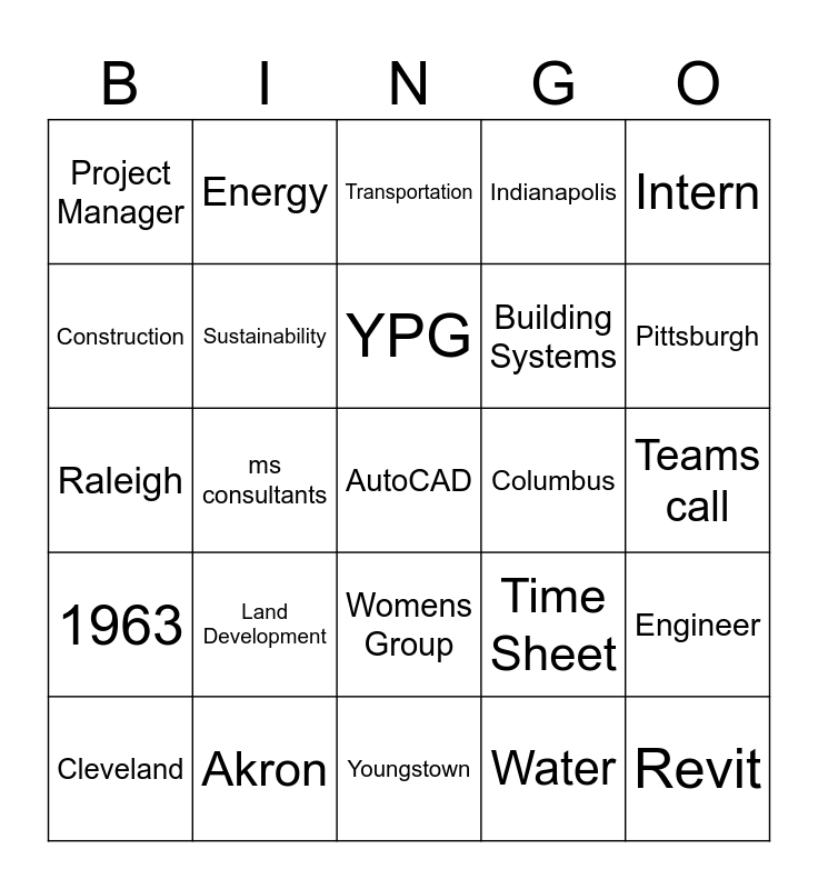 This bingo card has 28 words: Engineer, Architect, Building Systems, Water, Construction, Transportation, Energy, 1963, Columbus, Cleveland, Raleigh, Indianapolis, Akron, Youngstown, Pittsburgh, Planners, Land Development, Sustainability, YPG, Womens Group, Project Manager, Revit, AutoCAD, ms consultants, Teams call, Time Sheet, Intern and Outlook.