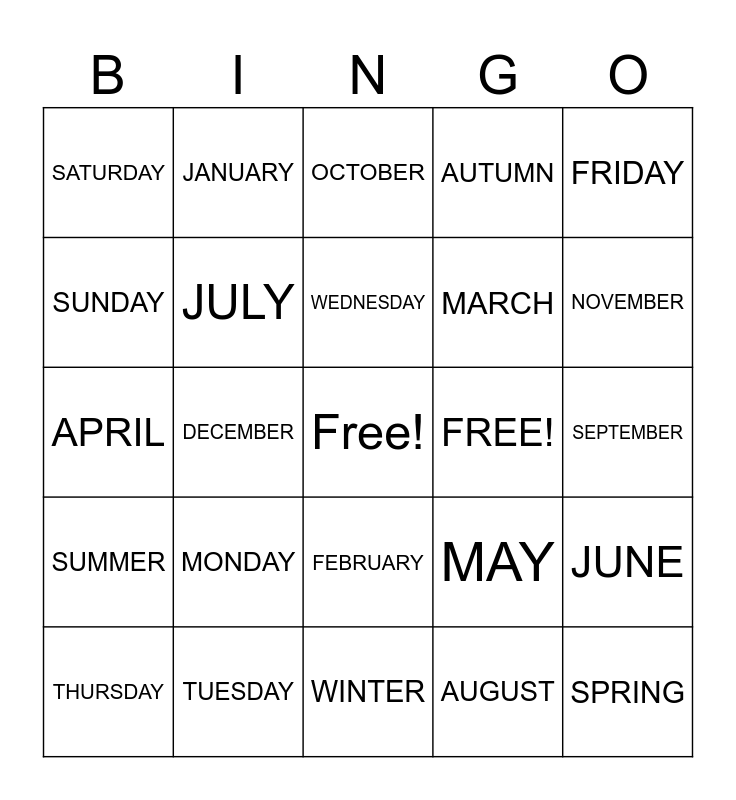 This bingo card has a free space and 24 words: MONDAY, TUESDAY, WEDNESDAY, THURSDAY, FRIDAY, SATURDAY, SUNDAY, JANUARY, FREE!, FEBRUARY, MARCH, APRIL, MAY, JUNE, JULY, AUGUST, SEPTEMBER, OCTOBER, NOVEMBER, DECEMBER, SPRING, SUMMER, AUTUMN and WINTER.