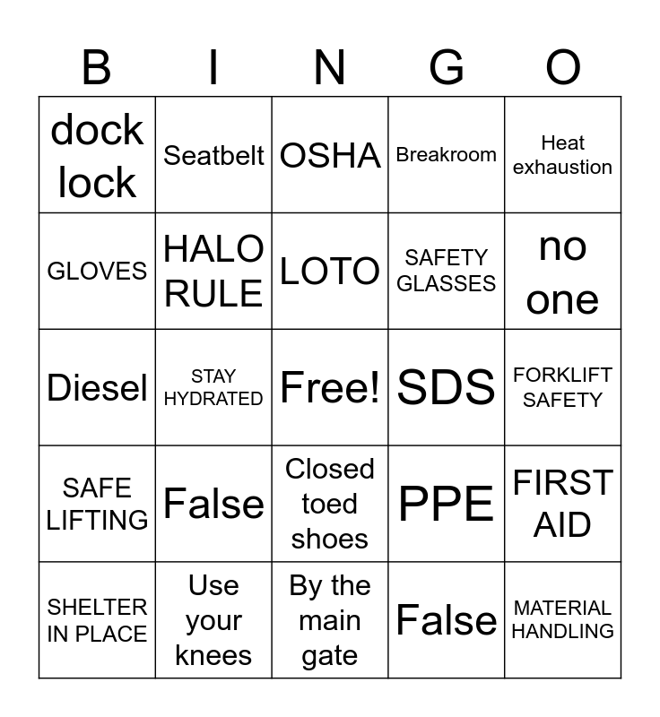 This bingo card has a free space and 45 words: LOTO, MATERIAL HANDLING, EMERGENCY ACTION PLAN, SHELTER IN PLACE, False, False, OSHA, True, Heat exhaustion, Use your knees, Breakroom, SDS, Closed toed shoes, False, Warehouse operators only, By the main gate, True, Diesel, The one numbered for your truck, no one, Seatbelt, Bernard, Go to the nearest exit, dock lock, SHELTER IN PLACE, FORKLIFT SAFETY, DOCK SAFETY, CONFINED SPACE, PPE, SAFE LIFTING, GOOD HOUSEKEEPING, FIRST AID, SAFE WALK PATHS, SITUATIONAL AWARENESS, AED, STAY HYDRATED, SAFE WORK PRACTICES, CPR, BLOODBORNE PATHOGENS, LOTO, GLOVES, SAFETY GLASSES, COMPOSITE TOE SHOES, HALO RULE and SDS.