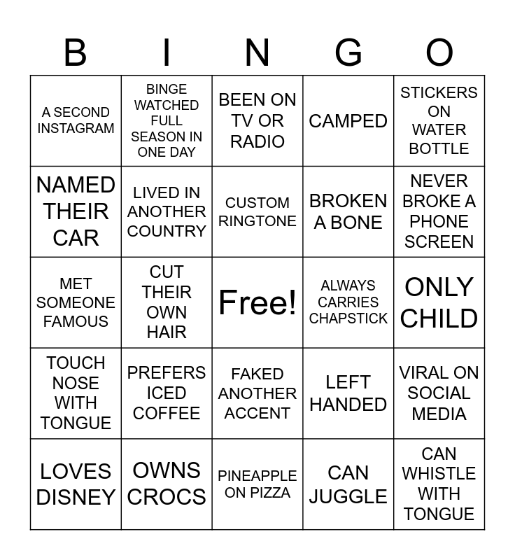 This bingo card has a free space and 24 words: PREFERS ICED COFFEE, OWNS CROCS, CUSTOM RINGTONE, LOVES DISNEY, STICKERS ON WATER BOTTLE, A SECOND INSTAGRAM, NAMED THEIR CAR, BINGE WATCHED FULL SEASON IN ONE DAY, ALWAYS CARRIES CHAPSTICK, FAKED ANOTHER ACCENT, BROKEN A BONE, MET SOMEONE FAMOUS, LEFT HANDED, VIRAL ON SOCIAL MEDIA, LIVED IN ANOTHER COUNTRY, CAN JUGGLE, ONLY CHILD, BEEN ON TV OR RADIO, NEVER BROKE A PHONE SCREEN, CUT THEIR OWN HAIR, CAN WHISTLE WITH TONGUE, TOUCH NOSE WITH TONGUE, CAMPED and PINEAPPLE ON PIZZA.