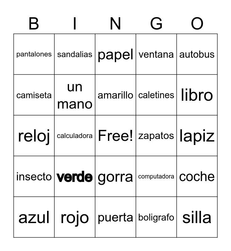 This bingo card has a free space and 24 words: verde, rojo, amarillo, azul, autobus, pantalones, camiseta, sandalias, zapatos, gorra, caletines, reloj, computadora, coche, un mano, boligrafo, lapiz, papel, libro, calculadora, silla, insecto, ventana and puerta.