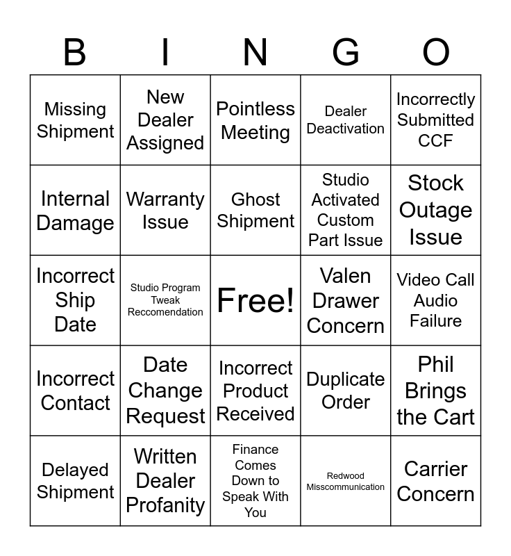 This bingo card has a free space and 29 words: Delayed Shipment, Incorrectly Chosen Shipping Method, Studio Program Tweak Reccomendation, External Damage, Missing Shipment, Pointless Meeting, Warranty Issue, Date Change Request, Valen Drawer Concern, Written Dealer Profanity, Video Call Audio Failure, Carrier Concern, Finance Comes Down to Speak With You, Redwood Misscommunication, Stock Outage Issue, Network Failure, Incorrect Product Received, Incorrect Contact, Incorrectly Submitted CCF, Incorrect Ship Date, Duplicate Order, Missing Drop Shipment Part(s), Studio Activated Custom Part Issue, Internal Damage, Dealer Deactivation, New Dealer Assigned, Phil Brings the Cart, Ghost Shipment and I found a BUG.