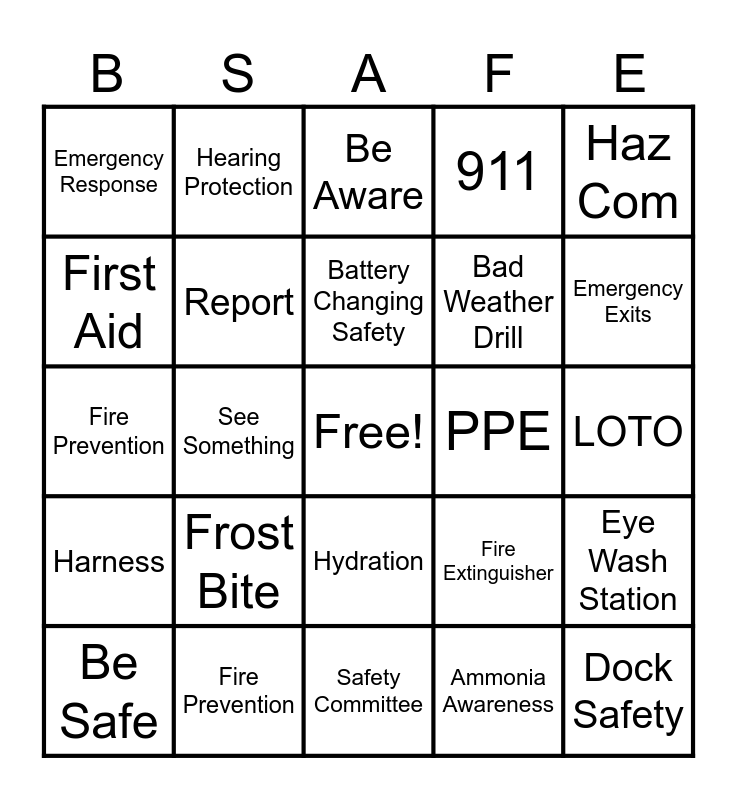 This bingo card has a free space and 29 words: Be Safe, Fire Drill, See Something, Say Something, Emergency Response, Be Aware, Report, Frost Bite, PPE, Fire Prevention, LOTO, Dock Safety, Safety Committee, Ammonia Awareness, Emergency Exits, Heat Protection, Hydration, Harness, Haz Com, Fire Prevention, Fire Extinguisher, BBP, Bad Weather Drill, First Aid, 911, Hearing Protection, Eye Wash Station, Battery Changing Safety and Proper lifting.
