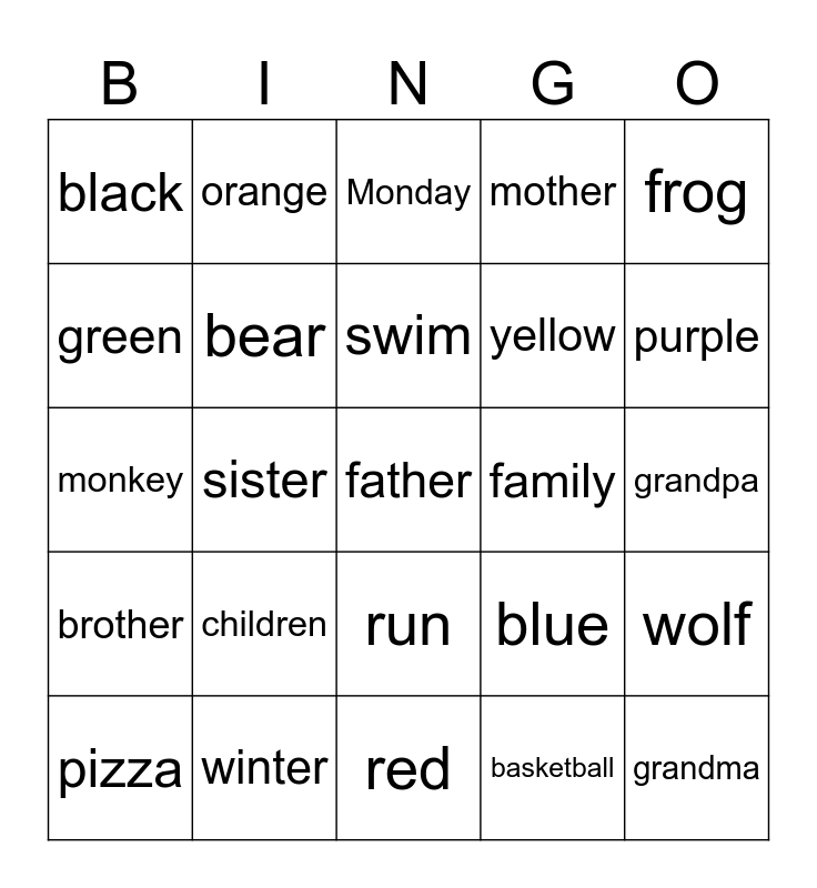 This bingo card has a free space and 39 words: apple, ant, cat, bear, pizza, run, swim, jump, frog, brother, sister, mother, grandma, grandpa, family, children, Russia, black, brown, blue, green, red, yellow, purple, dog, we, and, or, can, orange, pink, white, Monday, winter, basketball, horse, wolf, monkey and tree.