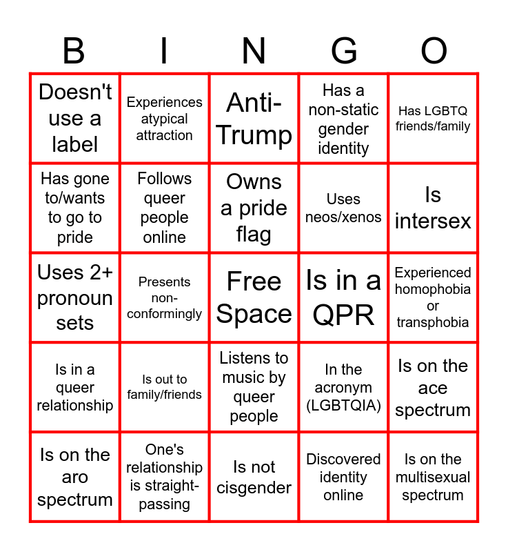 This bingo card has a free space and 24 words: Is out to family/friends, One's relationship is straight-passing, Owns a pride flag, Is on the aro spectrum, Has LGBTQ friends/family, Doesn't use a label, Has gone to/wants to go to pride, Experiences atypical attraction, Is in a QPR, Listens to music by queer people, Uses neos/xenos, Uses 2+ pronoun sets, In the acronym (LGBTQIA), Is on the ace spectrum, Follows queer people online, Discovered identity online, Experienced homophobia or transphobia, Anti-Trump, Is intersex, Presents non-conformingly, Is on the multisexual spectrum, Is in a queer relationship, Has a non-static gender identity and Is not cisgender.