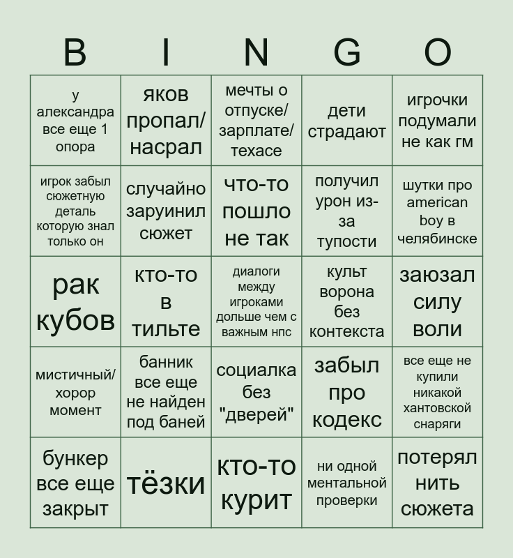 This bingo card has a free space and 24 words: банник все еще не найден под баней, тёзки, что-то пошло не так, бункер все еще закрыт, игрочки подумали не как гм, у александра все еще 1 опора, игрок забыл сюжетную деталь которую знал только он, яков пропал/насрал, культ ворона без контекста, социалка без "дверей", получил урон из-за тупости, рак кубов, забыл про кодекс, все еще не купили никакой хантовской снаряги, случайно заруинил сюжет, ни одной ментальной проверки, заюзал силу воли, мечты о отпуске/зарплате/техасе, шутки про ameriсan boy в челябинске, кто-то в тильте, потерял нить сюжета, мистичный/хорор момент, дети страдают and кто-то курит.