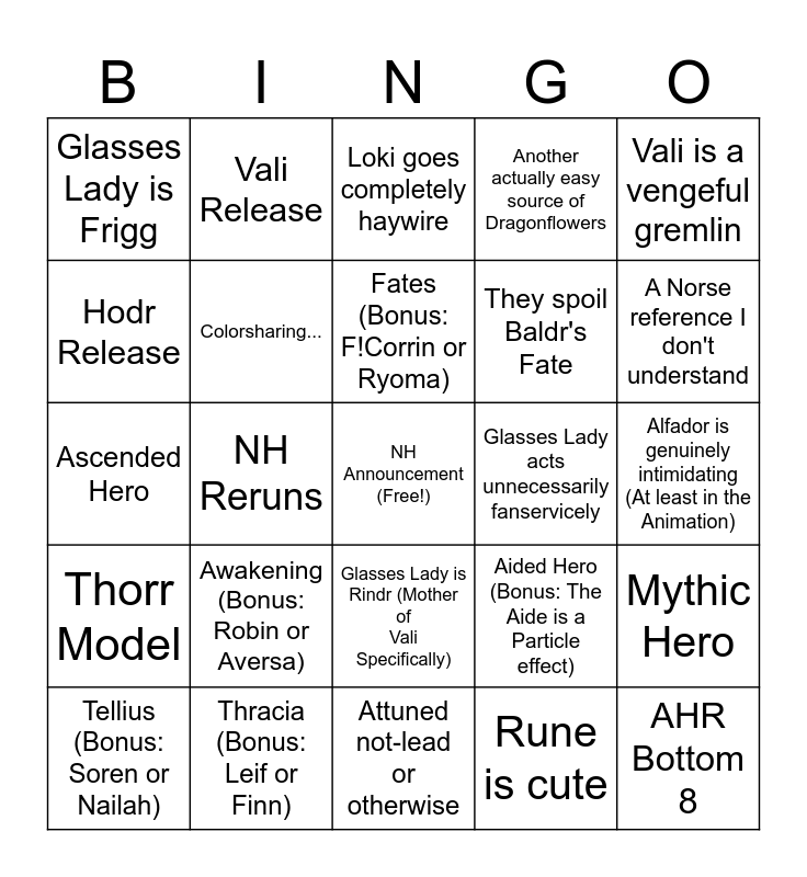 This bingo card has a free space and 24 words: Awakening (Bonus: Robin or Aversa), Thracia (Bonus: Leif or Finn), Fates (Bonus: F!Corrin or Ryoma), Tellius (Bonus: Soren or Nailah), Vali is a vengeful gremlin, Glasses Lady is Frigg, Hodr Release, Vali Release, Glasses Lady acts unnecessarily fanservicely, Glasses Lady is Rindr (Mother of Vali Specifically), They spoil Baldr's Fate, Ascended Hero, Aided Hero (Bonus: The Aide is a Particle effect), Mythic Hero, Colorsharing..., Rune is cute, Alfador is genuinely intimidating (At least in the Animation), Loki goes completely haywire, A Norse reference I don't understand, NH Reruns, AHR Bottom 8, Thorr Model, Another actually easy source of Dragonflowers and Attuned not-lead or otherwise.