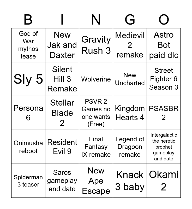 This bingo card has a free space and 24 words: Resident Evil 9, Saros gameplay and date, Wolverine, Spiderman 3 teaser, Astro Bot paid dlc, God of War mythos tease, Sly 5, New Jak and Daxter, Kingdom Hearts 4, Final Fantasy IX remake, New Uncharted, Persona 6, Legend of Dragoon remake, Intergalactic the heretic prophet gameplay and date, Silent Hill 3 Remake, Knack 3 baby, PSASBR 2, Gravity Rush 3, Street Fighter 6 Season 3, Stellar Blade 2, Okami 2, Onimusha reboot, Medievil 2 remake and New Ape Escape.
