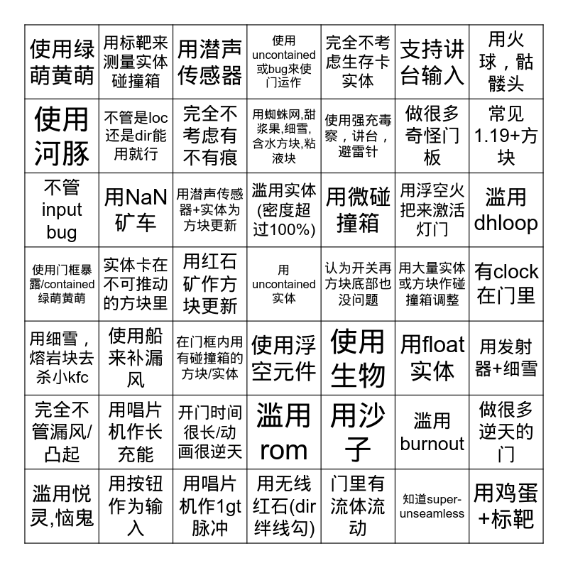 This bingo card has 49 words: 滥用burnout, 做很多奇怪门板, 门里有流体流动, 实体卡在不可推动的方块里, 用潜声传感器+实体为方块更新, 有clock在门里, 用标靶来测量实体碰撞箱, 用唱片机作1gt脉冲, 支持讲台输入, 使用浮空元件, 用火球,骷髅头, 使用uncontained或bug來使门运作, 用浮空火把来激活灯门, 用微碰撞箱, 用唱片机作长充能, 用大量实体或方块作碰撞箱调整, 使用河豚, 常见1.19+方块, 做很多逆天的门, 完全不考虑生存卡实体, 使用强充毒察,讲台,避雷针, 用红石矿作方块更新, 使用绿萌黄萌, 不管是loc还是dir能用就行, 滥用悦灵,恼鬼, 完全不考虑有不有痕, 滥用 dhloop, 用按钮作为输入, 滥用实体(密度超过100%), 用NaN矿车, 用鸡蛋+标靶, 认为开关再方块底部也没问题, 完全不管漏风/凸起, 开门时间很长/动画很逆天, 使用门框暴露/contained绿萌黄萌, 使用生物, 用float实体, 用发射器+细雪, 不管input bug, 在门框内用有碰撞箱的方块/实体, 滥用rom, 用细雪,熔岩块去杀小kfc, 用uncontained 实体, 用无线红石(dir绊线勾), 用蜘蛛网,甜浆果,细雪,含水方块,粘液块, 用潜声传感器, 用沙子, 使用船来补漏风 and 知道super-unseamless.