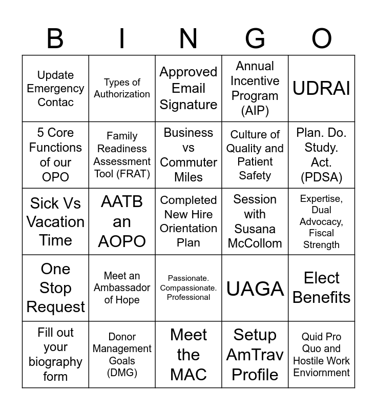 This bingo card has a free space and 24 words: Meet an Ambassador of Hope, Donor Management Goals (DMG), Business vs Commuter Miles, Fill out your biography form, UDRAI, Update Emergency Contac, 5 Core Functions of our OPO, Types of Authorization, Session with Susana McCollom, Passionate. Compassionate. Professional, Culture of Quality and Patient Safety, Sick Vs Vacation Time, UAGA, Elect Benefits, Family Readiness Assessment Tool (FRAT), Setup AmTrav Profile, Expertise, Dual Advocacy, Fiscal Strength, Approved Email Signature, Plan. Do. Study. Act. (PDSA), AATB an AOPO, Quid Pro Quo and Hostile Work Enviornment, One Stop Request, Annual Incentive Program (AIP) and Meet the MAC.