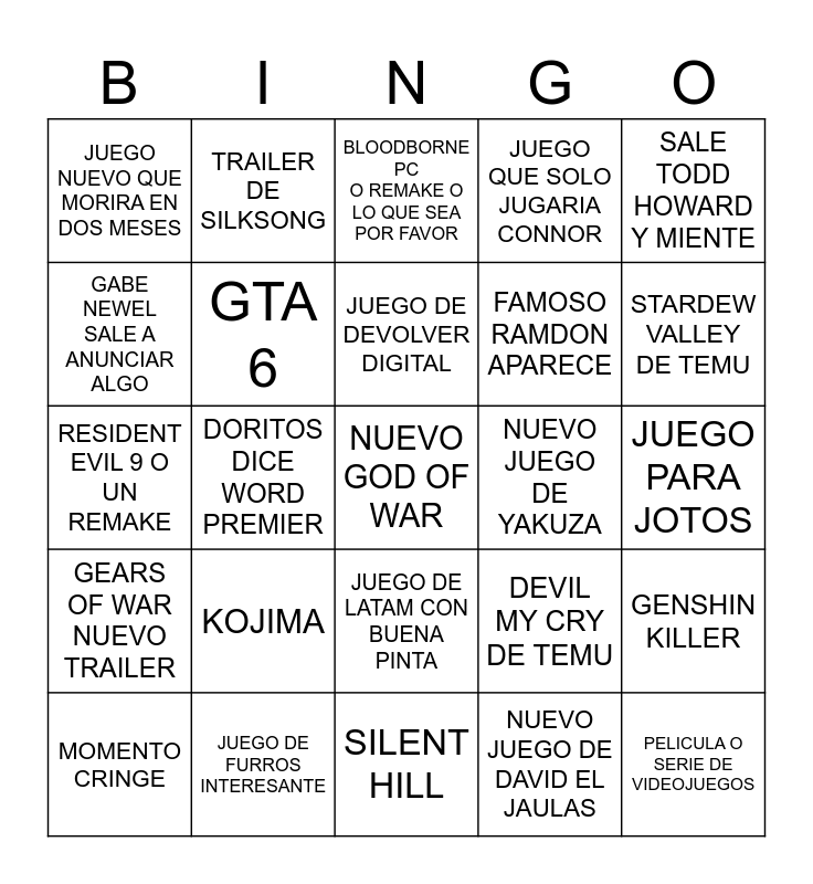 This bingo card has a free space and 24 words: KOJIMA, JUEGO DE FURROS INTERESANTE, JUEGO DE DEVOLVER DIGITAL, MOMENTO CRINGE, SALE TODD HOWARD Y MIENTE, JUEGO NUEVO QUE MORIRA EN DOS MESES, GABE NEWEL SALE A ANUNCIAR ALGO, TRAILER DE SILKSONG, NUEVO JUEGO DE YAKUZA, JUEGO DE LATAM CON BUENA PINTA, FAMOSO RAMDON APARECE, RESIDENT EVIL 9 O UN REMAKE, DEVIL MY CRY DE TEMU, GENSHIN KILLER, GTA 6, NUEVO JUEGO DE DAVID EL JAULAS, JUEGO PARA JOTOS, BLOODBORNE PC O REMAKE O LO QUE SEA POR FAVOR, STARDEW VALLEY DE TEMU, DORITOS DICE WORD PREMIER, PELICULA O SERIE DE VIDEOJUEGOS, GEARS OF WAR NUEVO TRAILER, JUEGO QUE SOLO JUGARIA CONNOR and SILENT HILL.