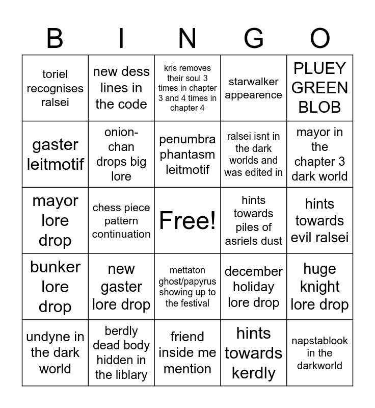 This bingo card has a free space and 24 words: new gaster lore drop, berdly dead body hidden in the liblary, penumbra phantasm leitmotif, undyne in the dark world, PLUEY GREEN BLOB, toriel recognises ralsei, gaster leitmotif, new dess lines in the code, hints towards piles of asriels dust, mettaton ghost/papyrus showing up to the festival, ralsei isnt in the dark worlds and was edited in, mayor lore drop, december holiday lore drop, huge knight lore drop, onion-chan drops big lore, hints towards kerdly, hints towards evil ralsei, kris removes their soul 3 times in chapter 3 and 4 times in chapter 4, mayor in the chapter 3 dark world, chess piece pattern continuation, napstablook in the darkworld, bunker lore drop, starwalker appearence and friend inside me mention.