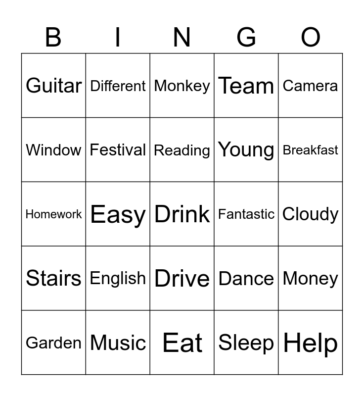 This bingo card has a free space and 24 words: English, Music, Reading, Garden, Camera, Guitar, Window, Different, Fantastic, Drive, Young, Homework, Dance, Money, Festival, Sleep, Cloudy, Monkey, Breakfast, Easy, Help, Stairs, Team and Eat.