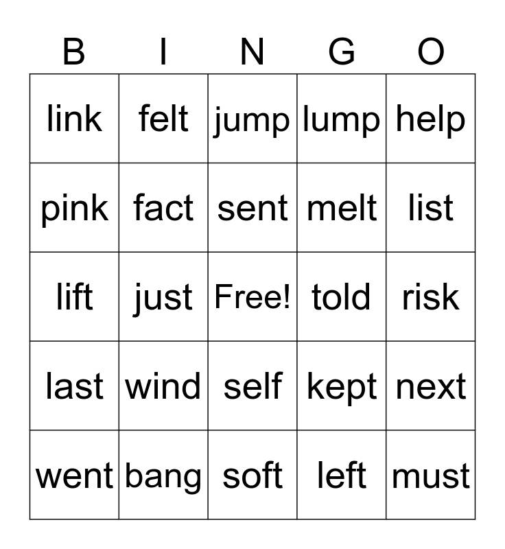This bingo card has a free space and 24 words: wind, bang, sent, went, help, link, pink, felt, told, self, melt, lift, kept, next, fact, left, risk, jump, list, just, must, last, lump and soft.