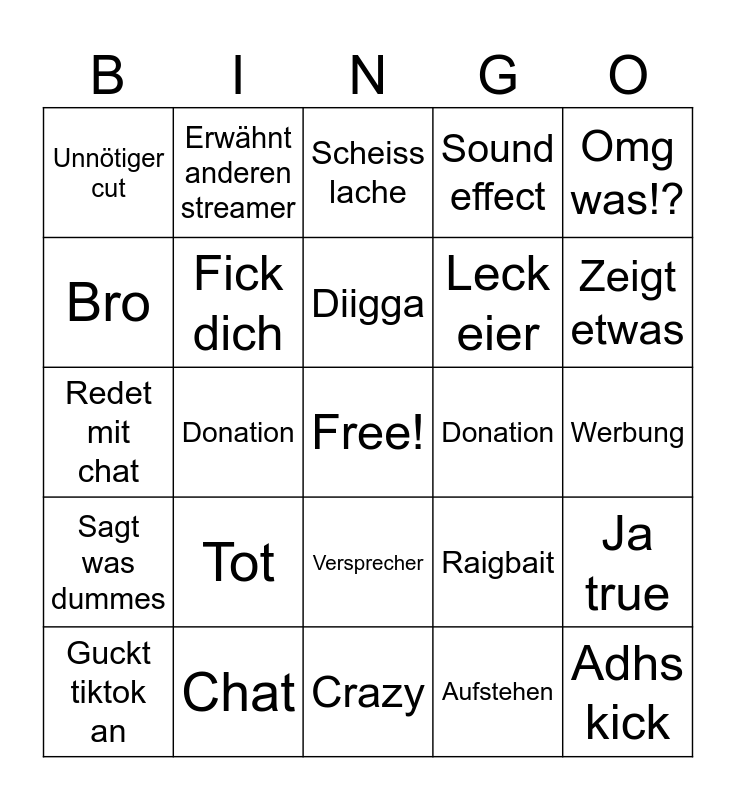 This bingo card has a free space and 24 words: Tot, Chat, Diigga, Guckt tiktok an, Omg was!?, Unnötiger cut, Bro, Erwähnt anderen streamer, Donation, Versprecher, Leck eier, Redet mit chat, Raigbait, Ja true, Fick dich, Aufstehen, Werbung, Scheiss lache, Zeigt etwas, Donation, Adhs kick, Sagt was dummes, Sound effect and Crazy.