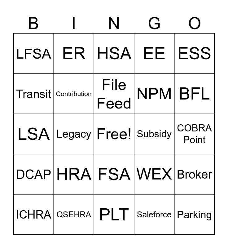 This bingo card has a free space and 29 words: ICHRA, QB, Legacy, COBRA, LFSA, HSA, Contribution, HRA, Subsidy, QSEHRA, COBRA Point, Parking, PLT, Saleforce, BFL, SPM, FSA, DCAP, ESS, LSA, WEX, Claim, NPM, Transit, EE, ER, Broker, File Feed and Meetings.