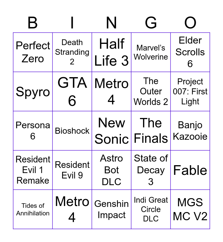 This bingo card has 112 words: Death Stranding 2, Monster Hunter Wilds DLC, DOOM: The Dark Ages DLC, Fable, The Outer Worlds 2, Ghosts of Yōtei, Marvel’s Wolverine, Ninja Gaiden 4, Clair Obscur: Expedition 33 DLC, Splinter Cell Remake, Assassin’s Creed, Persona 6, Gears of War: E-Day, Hogwarts Legacy 2, Lords of the Fallen 2, Project 007: First Light, Astro Bot DLC, 33 Immortals, Hollow Knight: Silksong, Resident Evil 9, Tides of Annihilation, Half Life 3, Yakuza 9, Project Century, New Sonic, Resident Evil 1 Remake, Metro 4, GTA 6, Persona 4 Remake, Congraband, Perfect Zero, Bioshock, MGS MC V2, Slay the Spire 2, Starfield DLC, Elder Scrolls 6, Bloodborne, Control 2, Halo, Banjo Kazooie, Twisted Metal, Fortnite, Call of Duty, Destiny 2, The Finals, Minecraft, Sea of Thieves, Genshin Impact, Xbox Handheld, State of Decay 3, Spyro, Indi Great Circle DLC, Perfect Dark, Silent Hill X Remake, Helldivers 2, Until Dawn 2, Death Stranding 2, Monster Hunter Wilds DLC, DOOM: The Dark Ages DLC, Fable, The Outer Worlds 2, Ghosts of Yōtei, Marvel’s Wolverine, Ninja Gaiden 4, Clair Obscur: Expedition 33 DLC, Splinter Cell Remake, Assassin’s Creed, Persona 6, Gears of War: E-Day, Hogwarts Legacy 2, Lords of the Fallen 2, Project 007: First Light, Astro Bot DLC, 33 Immortals, Hollow Knight: Silksong, Resident Evil 9, Tides of Annihilation, Half Life 3, Yakuza 9, Project Century, New Sonic, Resident Evil 1 Remake, Metro 4, GTA 6, Persona 4 Remake, Congraband, Perfect Zero, Bioshock, MGS MC V2, Slay the Spire 2, Starfield DLC, Elder Scrolls 6, Bloodborne, Control 2, Halo, Banjo Kazooie, Twisted Metal, Fortnite, Call of Duty, Destiny 2, The Finals, Minecraft, Sea of Thieves, Genshin Impact, Xbox Handheld, State of Decay 3, Spyro, Indi Great Circle DLC, Perfect Dark, Silent Hill X Remake, Helldivers 2 and Until Dawn 2.