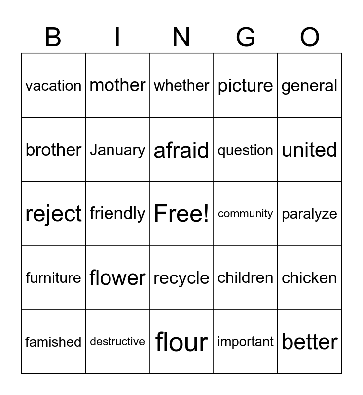 This bingo card has a free space and 50 words: apple, better, birthday, flour, flower, goodbye, mother, morning, brother, together, January, picture, chicken, children, laughter, window, afraid, community, enough, general, friendly, important, vacation, question, impossible, independent, united, weather, whether, recycle, alter, attempt, benefit, complete, destructive, flexible, embrace, forbid, modest, paralyze, pessimist, represent, sensitive, venture, famished, reject, recommend, expose, furniture and astound.
