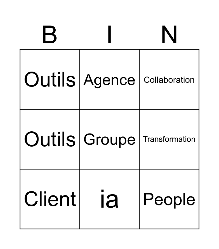 This bingo card has a free space and 11 words: Outils, ia, People, Client, Agence, Collaboration, Transformation, WPP, Outils, Outils and Outils.