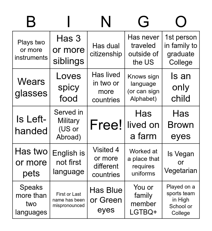 This bingo card has a free space and 24 words: English is not first language, First or Last name has been mispronounced, Has lived in two or more countries, Speaks more than two languages, 1st person in family to graduate College, Plays two or more instruments, Wears glasses, Has 3 or more siblings, Has lived on a farm, Visited 4 or more different countries, Knows sign language (or can sign Alphabet), Is Left-handed, Worked at a place that requires uniforms, Is Vegan or Vegetarian, Loves spicy food, You or family member LGTBQ+, Has Brown eyes, Has dual citizenship, Is an only child, Served in Military (US or Abroad), Played on a sports team in High School or College, Has two or more pets, Has never traveled outside of the US and Has Blue or Green eyes.
