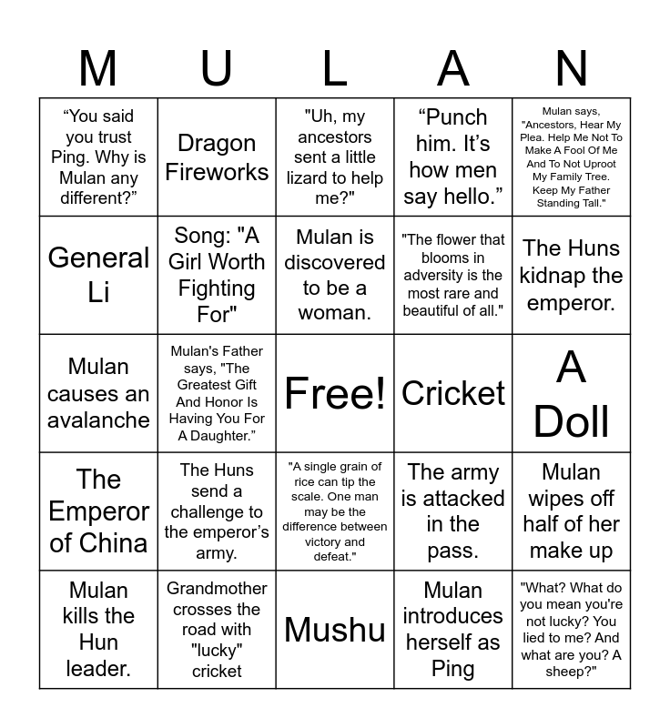 This bingo card has a free space and 39 words: Mulan fails at the matchmaker., Song: I'll make a man out of you, Mulan returns to her family with honor., Song: "A Girl Worth Fighting For", Mulan kills the Hun leader., "A single grain of rice can tip the scale. One man may be the difference between victory and defeat.", Mulan is discovered to be a woman., "I'm travel-sized for your convenience!", Mulan says, "Ancestors, Hear My Plea. Help Me Not To Make A Fool Of Me And To Not Uproot My Family Tree. Keep My Father Standing Tall.", The Emperor of China, Mulan's Father says, "The Greatest Gift And Honor Is Having You For A Daughter.”, “Punch him. It’s how men say hello.”, "What? What do you mean you're not lucky? You lied to me? And what are you? A sheep?", A Doll, Cricket, The Huns send a challenge to the emperor’s army., Song: "I'll Make a Man Out of You", “You said you trust Ping. Why is Mulan any different?”, Mulan retrieves the arrow from the top of the post, proving herself to the soldiers., The army is attacked in the pass., General Li, Mushu, "The flower that blooms in adversity is the most rare and beautiful of all.", The Huns kidnap the emperor., "Dishonour on your cow", Mulan cuts her hair, Great Wall of China is shown, The ancestors speak to Mushu, Mushu pretends to be the dragon statue, Dragon Fireworks, Mulan gets dressed up to meet the matchmaker, Little Brother feeds the chickens, "Uh, my ancestors sent a little lizard to help me?", Grandmother crosses the road with "lucky" cricket, Mulan introduces herself as Ping, Mushu makes a smiley face breakfast for Mulan, Mulan wipes off half of her make up, Mulan causes an avalanche and "Would you like to stay for dinner?" "Would you like to stay forever?".