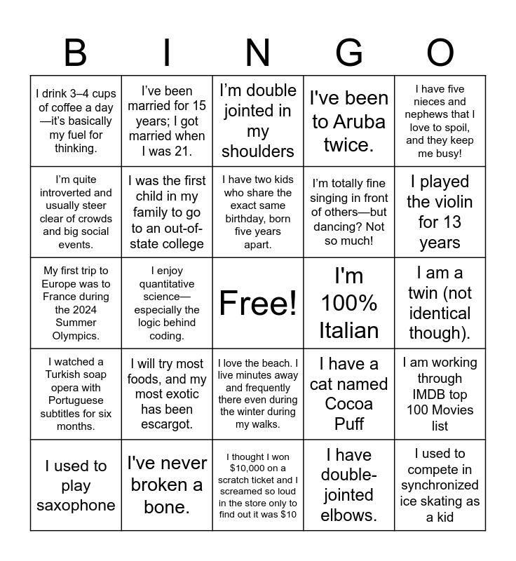 This bingo card has a free space and 65 words: I was born on Christmas eve, and share my birthday with my Dad and Partner, I read 60 books in 2024, my favorite was Divine Rivals or Dark Matter, I have driven cross country twice, I am working through IMDB top 100 Movies list, My go-to Karaoke song is no scrubs, I’ve traveled to 14 different countries, spanning from the Far East to the USA., I’ve been married for 15 years; I got married when I was 21., I’m planning to complete my second and third master’s degrees by 2028., I have two kids who share the exact same birthday, born five years apart., I once won a TV and a home theater system from an instant-win soda bottle., I love the beach. I live minutes away and frequently there even during the winter during my walks., I love to travel. It’s hard to narrow down a favorite but Venice is among the top., I am a twin (not identical though)., I have five nieces and nephews that I love to spoil, and they keep me busy!, I am really interested in history., I’m quite introverted and usually steer clear of crowds and big social events., I enjoy quantitative science—especially the logic behind coding., I drink 3–4 cups of coffee a day—it’s basically my fuel for thinking., I’m an evening person and usually fall asleep pretty late at night., I’m totally fine singing in front of others—but dancing? Not so much!, I will try most foods, and my most exotic has been escargot., I watched a Turkish soap opera with Portuguese subtitles for six months., I've been to Aruba twice., I won the spelling bee in my elementary school two years in a row., I can count to 10 in three languages., I've broken my wrist on two separate occasions doing the same exact thing, I might be distantly related to Barack Obama (emphasis on might and distantly), I play guitar, bass, and ukulele, I used to compete in synchronized ice skating as a kid, My favorite place I've traveled to is Amsterdam, I used to play saxophone, I hate vinegar, I taught fan dancing in college and also did hip hop, I currently have a wedding/couples photography business. I used to have a sticker business as well and also sold baked goods at one point!, I have a cat named Cocoa Puff, I've never broken a bone., I got a fish bone stuck in my throat when I was younger., My first trip to Europe was to France during the 2024 Summer Olympics., I have double-jointed elbows., I've rung a bell weighing 13 tons., I was the first child in my family to go to an out-of-state college, I'm left handed, I'm 100% Italian, I was an extra on an episode of the Bachelorette, I almost went back to school to become an ultrasound tech, I am a middle child, I played the violin for 13 years, I am a huge fan of the Hunger Games series and movies, I've never broken a bone, I studied abroad in London during the summer of my freshman year, Favorite vacay spot – York Beach, ME, Favorite movie – Lost Boys, First concert attended – NSYNC, I thought I won $10,000 on a scratch ticket and I screamed so loud in the store only to find out it was $10, I make an amazing buffalo chicken dip, I nannied for billionaires, I started going grey at 16 years old, I’m double jointed in my shoulders, I once did a crossword and had coffee with Ray Magliozzi (Car Talk), I’ve been in four states at once, I have a lot of cacti at home, I recently learned how to shoot a shotgun, I've playing a lot of backgammon recently, My name is a family last name and I love forsythias!.