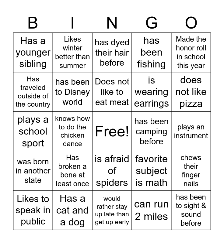 This bingo card has a free space and 24 words: Has broken a bone at least once, Has a cat and a dog, Does not like to eat meat, Likes to speak in public, Made the honor roll in school this year, Has a younger sibling, Has traveled outside of the country, Likes winter better than summer, has been camping before, is afraid of spiders, is wearing earrings, plays a school sport, favorite subject is math, chews their finger nails, has been to Disney world, can run 2 miles, plays an instrument, has dyed their hair before, does not like pizza, knows how to do the chicken dance, has been to sight & sound before, was born in another state, has been fishing and would rather stay up late than get up early.