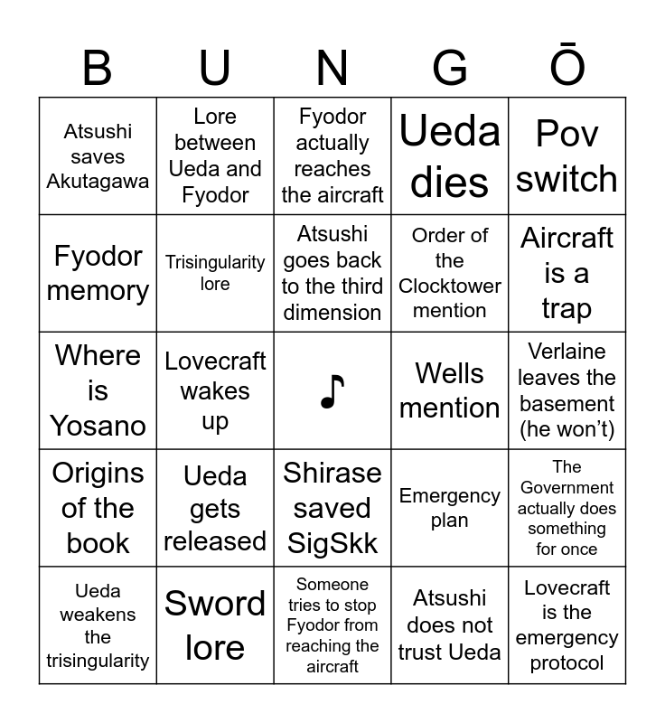 This bingo card has a free space and 24 words: Ueda gets released, Sword lore, Atsushi goes back to the third dimension, Ueda weakens the trisingularity, Pov switch, Atsushi saves Akutagawa, Fyodor memory, Lore between Ueda and Fyodor, Wells mention, Shirase saved SigSkk, Order of the Clocktower mention, Where is Yosano, Emergency plan, The Government actually does something for once, Trisingularity lore, Atsushi does not trust Ueda, Verlaine leaves the basement (he won’t), Fyodor actually reaches the aircraft, Aircraft is a trap, Lovecraft wakes up, Lovecraft is the emergency protocol, Origins of the book, Ueda dies and Someone tries to stop Fyodor from reaching the aircraft.