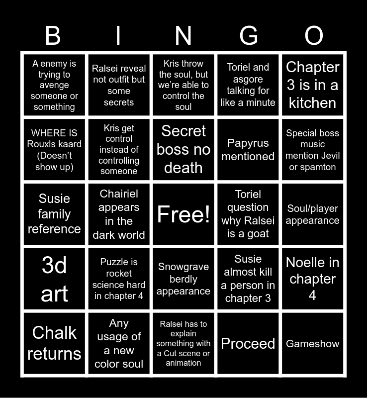 This bingo card has a free space and 48 words: Queen joins the team, Any usage of a new color soul, Undyne fights you, Massive amount of people becomes stone, Special boss music mention Jevil or spamton, King escapes?!?, Ralsei reveal not outfit but some secrets, Amen break in one of the music, Toriel question why Ralsei is a goat, Susie get her healing to 2 heal point!, WHERE IS Rouxls kaard (Doesn’t show up), Kris get control instead of controlling someone, Muffet showed, Noelle in chapter 4, A weird route in chapter 4, A symbol or image of gaster, Kris throw the soul, but we’re able to control the soul, Susie almost kill a person in chapter 3, Berdly in the hospital replacing Rudy bed?, A enemy is trying to avenge someone or something, Puzzle is rocket science hard in chapter 4, Ralsei has to explain something with a Cut scene or animation, Toriel and asgore talking for like a minute, Chapter 3 is in a kitchen, Reference to a meme or youtuber, Chairiel appears in the dark world, Secret boss no death, It's a beautiful day outside is said, Soul/player appearance, 3d art, Canon death of a npc, New dark ally, Rhythm style puzzle/minigame, Funny Explosion, Chalk returns, Susie dies, MOSSSSSSS, Proceed, Gameshow, Gaster reference, Either spamton or jevil mentioned, Snowgrave berdly appearance, Papyrus mentioned, Dog, Susie family reference, Title card, New students in school and Friend inside me.