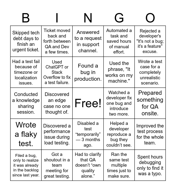 This bingo card has a free space and 24 words: Discovered a performance issue during load testing., Got a shoutout in a team meeting for great testing., Found a bug in production., Filed a bug, only to realize it was already in the backlog since last year., Rejected a developer's "It's not a bug; it's a feature" excuse., Skipped tech debt days to finish an urgent ticket., Had a test fail because of timezone or localization issues., Ticket moved back and forth between QA and Dev a few times., Watched a developer fix one bug and introduce two more., Disabled a test “temporarily” — 3 months ago., Used the phrase, "It works on my machine.", Conducted a knowledge sharing session., Helped a developer reproduce a bug they couldn’t see., Improved the test process for the whole team., Used ChatGPT or Stack Overflow to fix a test failure., Ran the same test multiple times just to make sure., Prepared something for QA onsite., Answered to a request in support channel., Wrote a test case for a completely unrealistic scenario., Discovered an edge case no one thought of., Spent hours debugging only to find it was a typo., Wrote a flaky test., Automated a task and saved hours of manual effort. and Had to clarify that QA doesn’t “own quality alone.”.