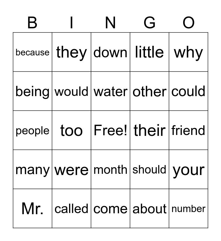 This bingo card has a free space and 24 words: were, called, water, Mr., why, because, being, they, their, month, other, people, should, your, would, about, friend, down, could, too, number, many, little and come.