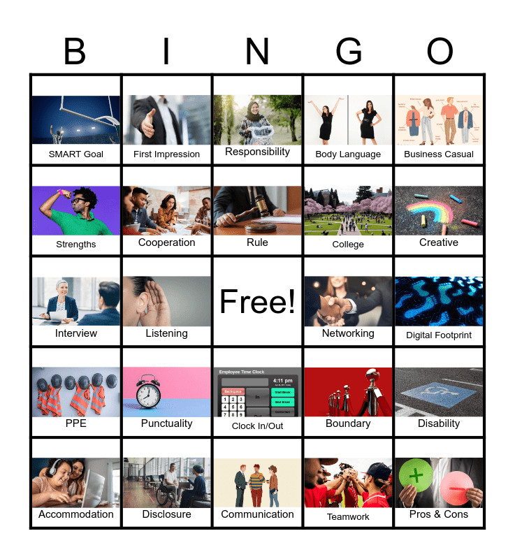 This bingo card has 36 images, a free space and 36 words: Employment, Career, Growth Mindset, Cooperation, Boundary, PPE, Rule, Respect, Business Casual, Hygiene, Listening, Body Language, Eye Contact, Networking, Creative, SMART Goal, Time Management, Punctuality, Pros & Cons, Responsibility, Digital Footprint, Disability, Disclosure, Accommodation, Communication, First Impression, Interview, Job, College, Strengths, Skills, Interests, Teamwork, Clock In/Out, Paycheck and Transportation.