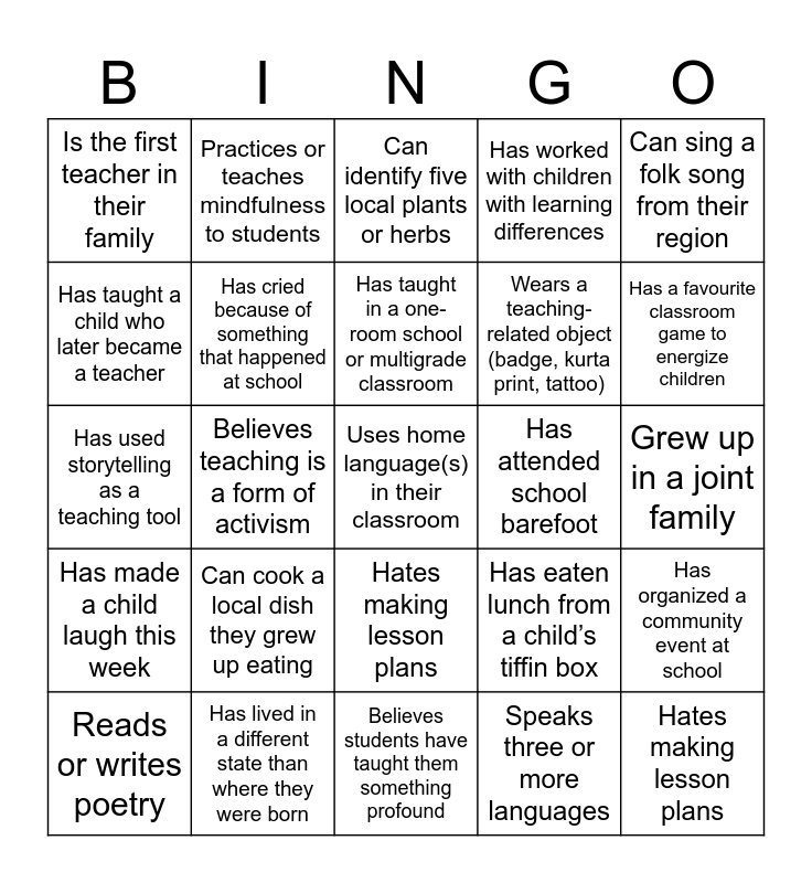 This bingo card has 26 words: Hates making lesson plans, Speaks three or more languages, Has taught in a one-room school or multigrade classroom, Has lived in a different state than where they were born, Can sing a folk song from their region, Is the first teacher in their family, Has taught a child who later became a teacher, Practices or teaches mindfulness to students, Grew up in a joint family, Has eaten lunch from a child’s tiffin box, Wears a teaching-related object (badge, kurta print, tattoo), Has used storytelling as a teaching tool, Has organized a community event at school, Reads or writes poetry, Believes teaching is a form of activism, Can make their own educational material (charts, puppets, games), Has worked with children with learning differences, Has made a child laugh this week, Can identify five local plants or herbs, Uses home language(s) in their classroom, Has a favourite classroom game to energize children, Believes students have taught them something profound, Has attended school barefoot, Can cook a local dish they grew up eating, Has cried because of something that happened at school and Hates making lesson plans.