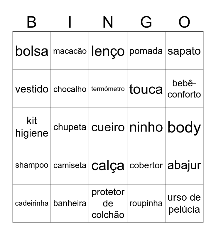 This bingo card has 70 words: mamadeira, chupeta, fralda, berço, body, mijão, macacão, meia, touca, luva, babador, paninho, lenço, pomada, sabonete, shampoo, banheira, termômetro, carrinho, bebê-conforto, cadeirinha, manta, cueiro, cobertor, travesseiro, almofada, almofada de amamentação, rede de descanso, ninho, mochila maternidade, bolsa, porta-fraldas, termômetro de banho, aspirador nasal, escova de cabelo, pente, toalha com capuz, toalhinha, roupinha, sapato, sandália, camiseta, calça, shortinho, vestidinho, vestido, sling, wrap, bomba de leite, absorvente para seios, lençol, colchão, protetor de colchão, mosquiteiro, abajur, móbile, chocalho, livrinho de pano, naninha, urso de pelúcia, kit higiene, pote de algodão, cotonete, álbum do bebê, pulseirinha de maternidade, escova de dentes infantil, tapetinho de atividades, cadeira de descanso, roupão and babá eletrônica.