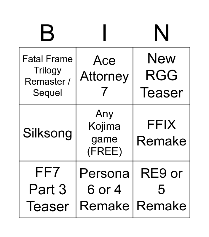 This bingo card has a free space and 8 words: FFIX Remake, New RGG Teaser, Ace Attorney 7, FF7 Part 3 Teaser, Fatal Frame Trilogy Remaster / Sequel, RE9 or 5 Remake, Silksong and Persona 6 or 4 Remake.