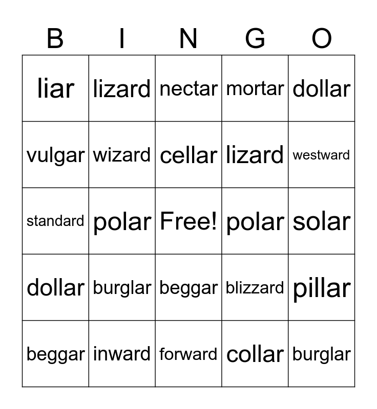 This bingo card has a free space and 24 words: beggar, burglar, cellar, collar, dollar, liar, lizard, nectar, polar, solar, standard, wizard, blizzard, pillar, vulgar, inward, forward, mortar, westward, dollar, polar, beggar, lizard and burglar.