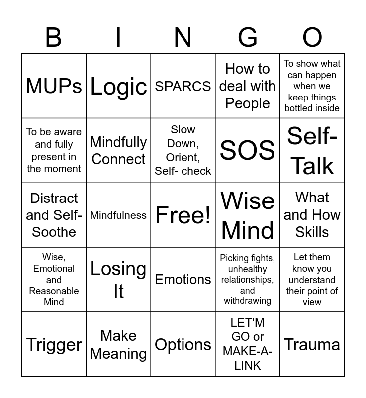 This bingo card has a free space and 24 words: Losing It, Make Meaning, Slow Down, Orient, Self- check, Trigger, To show what can happen when we keep things bottled inside, MUPs, To be aware and fully present in the moment, Logic, Wise Mind, Emotions, SOS, Distract and Self-Soothe, Picking fights, unhealthy relationships, and withdrawing, Let them know you understand their point of view, Mindfully Connect, LET'M GO or MAKE-A-LINK, What and How Skills, SPARCS, Self-Talk, Mindfulness, Trauma, Wise, Emotional and Reasonable Mind, How to deal with People and Options.