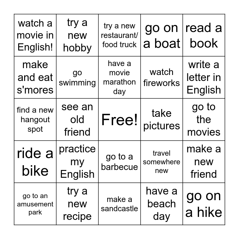This bingo card has a free space and 24 words: practice my English, try a new recipe, have a movie marathon day, go to an amusement park, read a book, watch a movie in English!, make and eat s'mores, try a new hobby, take pictures, go to a barbecue, watch fireworks, find a new hangout spot, travel somewhere new, make a new friend, go swimming, have a beach day, go to the movies, try a new restaurant/ food truck, write a letter in English, see an old friend, go on a hike, ride a bike, go on a boat and make a sandcastle.
