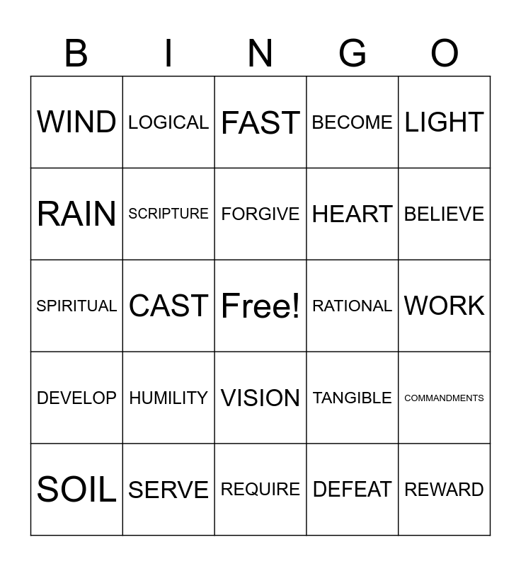 This bingo card has a free space and 24 words: HUMILITY, SERVE, FORGIVE, SOIL, LIGHT, WIND, RAIN, LOGICAL, RATIONAL, VISION, HEART, SPIRITUAL, TANGIBLE, COMMANDMENTS, SCRIPTURE, DEFEAT, WORK, FAST, BELIEVE, CAST, REWARD, DEVELOP, BECOME and REQUIRE.