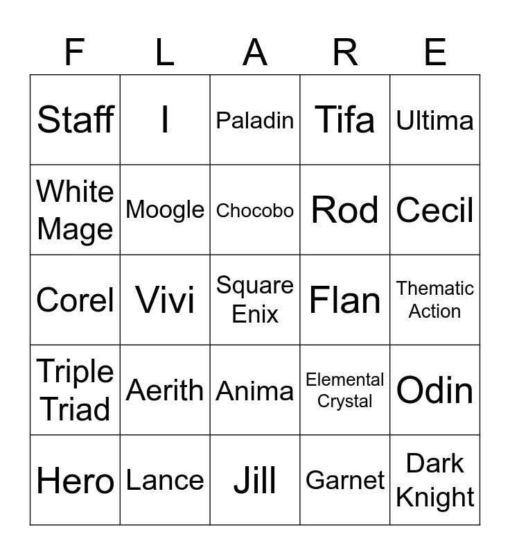 This bingo card has a free space and 168 words: I, __-ga, Airship, Sword, Chocobo, Materia, Black, Shiva, Village, Tonberrry, Transform, Sephiroth, Thematic Action, VII, I, II, III, IV, V, VI, VII, VIII, IX, X, XI, XII, XIII, XIV, XV, XIV, Sephiroth, Kefka, Hero, Cloud, Aerith, Zack, Locke, Celes, Tera, Black Mage, Blue Mage, Ga-spell, White Mage, Thematic Action, General Theo, Ardyn, Shiva, Leviathan, Rod, Sword, Lance, Dark Knight, Paladin, Elemental Crystal, Ragnarok, Fang, Gaius, Transform, He's a Dad, Malboro, Tonberry, Moogle, Merchant, Loose life, Gain life, Vehicle, Train, Airship, Chocobo, This AND That, SOLDIER, Anima, Odin, Bahamut, Alexander, Cid, Tonberry, Rat, Vincent, God, Dragon, Swamp, Mountain, Forest, Kain, Dragoon, Cecil, Dark Knight, Paladin, Island, Plains, Equipment, Flan, Jill, Clive, Sahagin, Robot, Y'shtola, City, Village, Titan, Adamantoise, Dinosaur, Bartz, Blitzball, Esper, Aeon, Eikon, Cactuar, Quina, Zidane, Steiner, Beatrice, Freya, Dagger, Garnet, Fenrir, Tifa, Torgal, Vanille, Snow, Lightning, Clive, Barrett, Ifrit, Firion, Gilgamesh, Support Magic, Queen Brahne, Ramuh, Triple Triad, Zell, Laguna, Ambrosia, Galin Beast, Auron, Corel, Thief, Dwarf, Equipment, Magiteck, Knights of the Round, Staff, Garuda, Auracite, Ultima, Ramen, Squall, World Map, Emet-Selch, Emperor, Chaos, Garland, Gladious, Ignis, Jenova, Joshua, Kuja, Noctis, Omega, Rinoa, Sera, Shantoto, Sin, Tidus, Ultimecia, Vivi and Yuna.