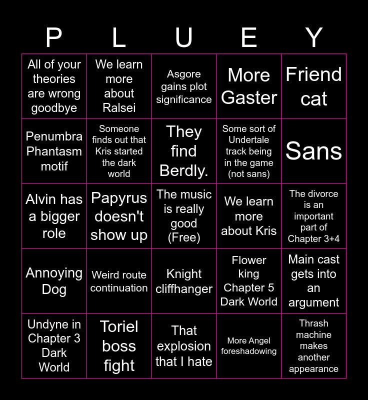 This bingo card has a free space and 24 words: Weird route continuation, Toriel boss fight, They find Berdly., Undyne in Chapter 3 Dark World, Friend cat, All of your theories are wrong goodbye, Penumbra Phantasm motif, We learn more about Ralsei, We learn more about Kris, Knight cliffhanger, Some sort of Undertale track being in the game (not sans), Alvin has a bigger role, Flower king Chapter 5 Dark World, Main cast gets into an argument, Someone finds out that Kris started the dark world, More Angel foreshadowing, The divorce is an important part of Chapter 3+4, Asgore gains plot significance, Sans, Papyrus doesn't show up, Thrash machine makes another appearance, Annoying Dog, More Gaster and That explosion that I hate.