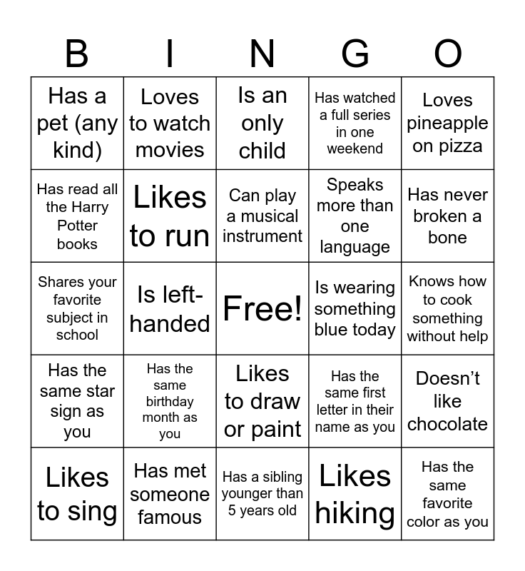 This bingo card has a free space and 25 words: Has the same birthday month as you, Has a sibling younger than 5 years old, Can play a musical instrument, Likes to sing, Loves pineapple on pizza, Has a pet (any kind), Has read all the Harry Potter books, Loves to watch movies, Is wearing something blue today, Likes to draw or paint, Speaks more than one language, Shares your favorite subject in school, Has the same first letter in their name as you, Doesn’t like chocolate, Likes to run, Has the same shoe size as you, Knows how to cook something without help, Is an only child, Has never broken a bone, Is left-handed, Has the same favorite color as you, Has met someone famous, Has the same star sign as you, Has watched a full series in one weekend and Likes hiking.