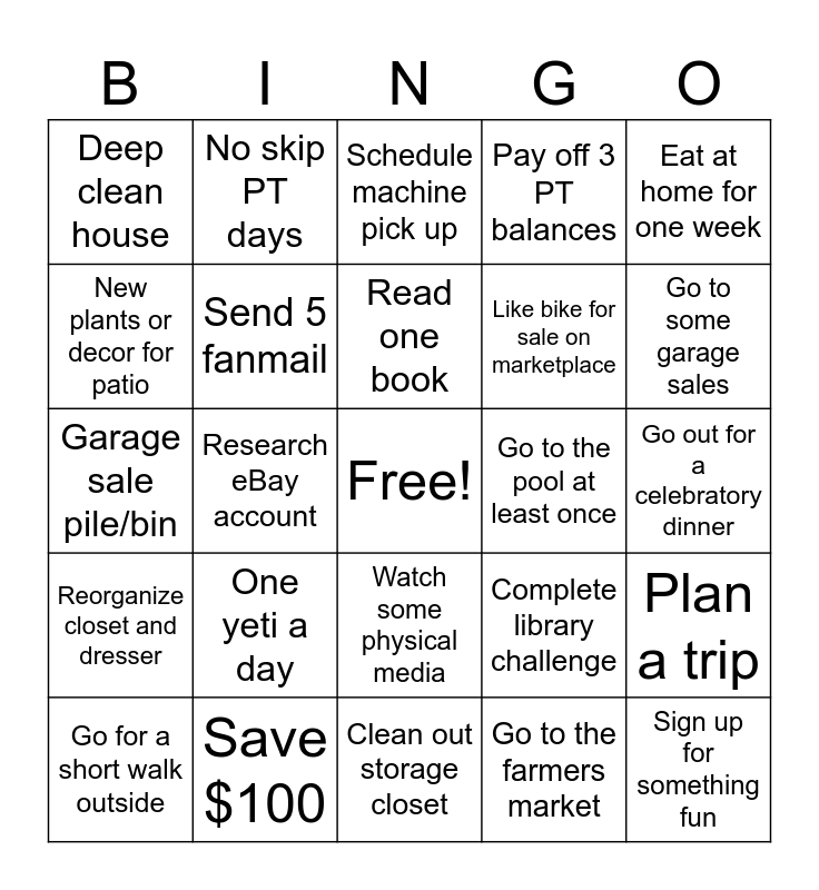 This bingo card has a free space and 24 words: One yeti a day, Save $100, Read one book, Go for a short walk outside, Eat at home for one week, Deep clean house, New plants or decor for patio, No skip PT days, Go to the pool at least once, Watch some physical media, Like bike for sale on marketplace, Garage sale pile/bin, Complete library challenge, Plan a trip, Send 5 fanmail, Go to the farmers market, Go out for a celebratory dinner, Schedule machine pick up, Go to some garage sales, Research eBay account, Sign up for something fun, Reorganize closet and dresser, Pay off 3 PT balances and Clean out storage closet.