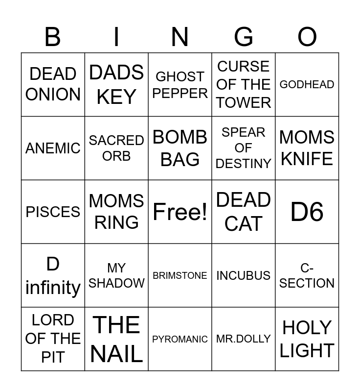 This bingo card has a free space and 24 words: MY SHADOW, THE NAIL, BOMB BAG, LORD OF THE PIT, GODHEAD, DEAD ONION, ANEMIC, DADS KEY, DEAD CAT, BRIMSTONE, SPEAR OF DESTINY, PISCES, INCUBUS, C-SECTION, SACRED ORB, MR.DOLLY, D6, GHOST PEPPER, MOMS KNIFE, MOMS RING, HOLY LIGHT, D infinity, CURSE OF THE TOWER and PYROMANIC.